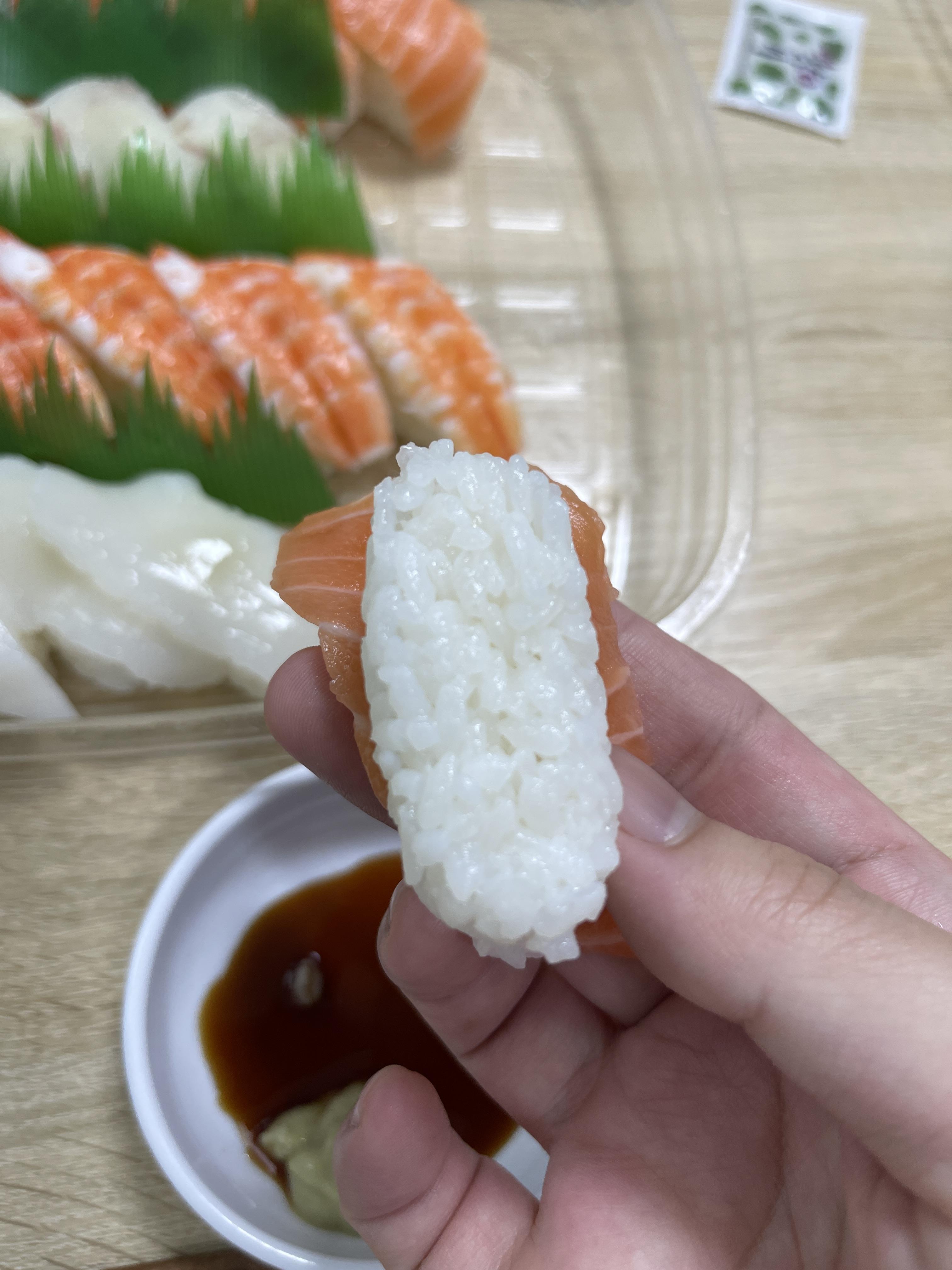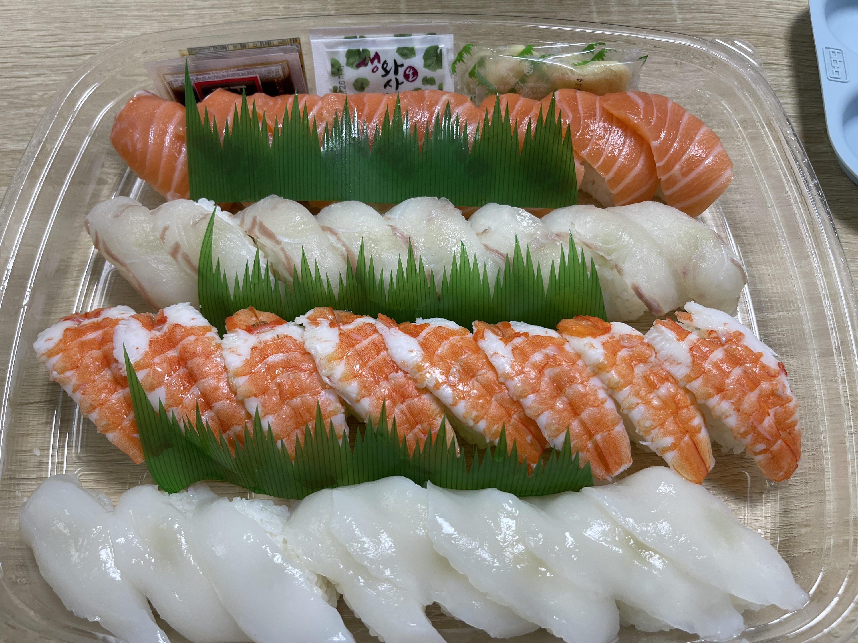 스시 위에 올려져 있는네타의 상태는 다들 훌륭합니다. 굳이 맛있는 순서를 고르자면 위에부터 그대로 쭉입니다. 코스트코 연어야 언제나 유명하죠. 광어는 기대보다는 살짝 이하였고, 새우도 평범하였습니다. 오징어는 원래 제 취향이 아니라서 별로였지만 쫀득쫀득해서 오징어 좋아하시는 분들에게는 잘 맞을 것 같습니다.