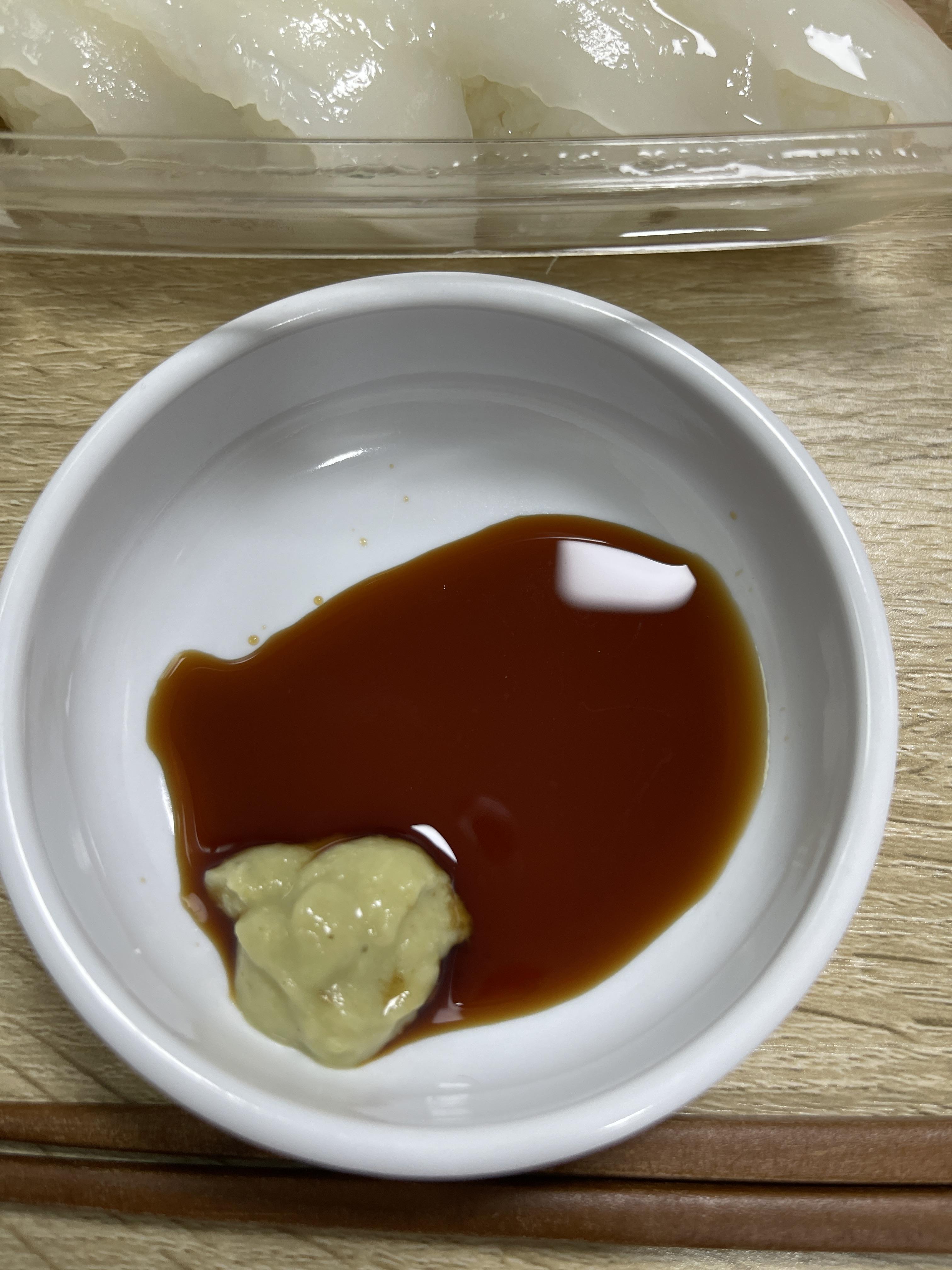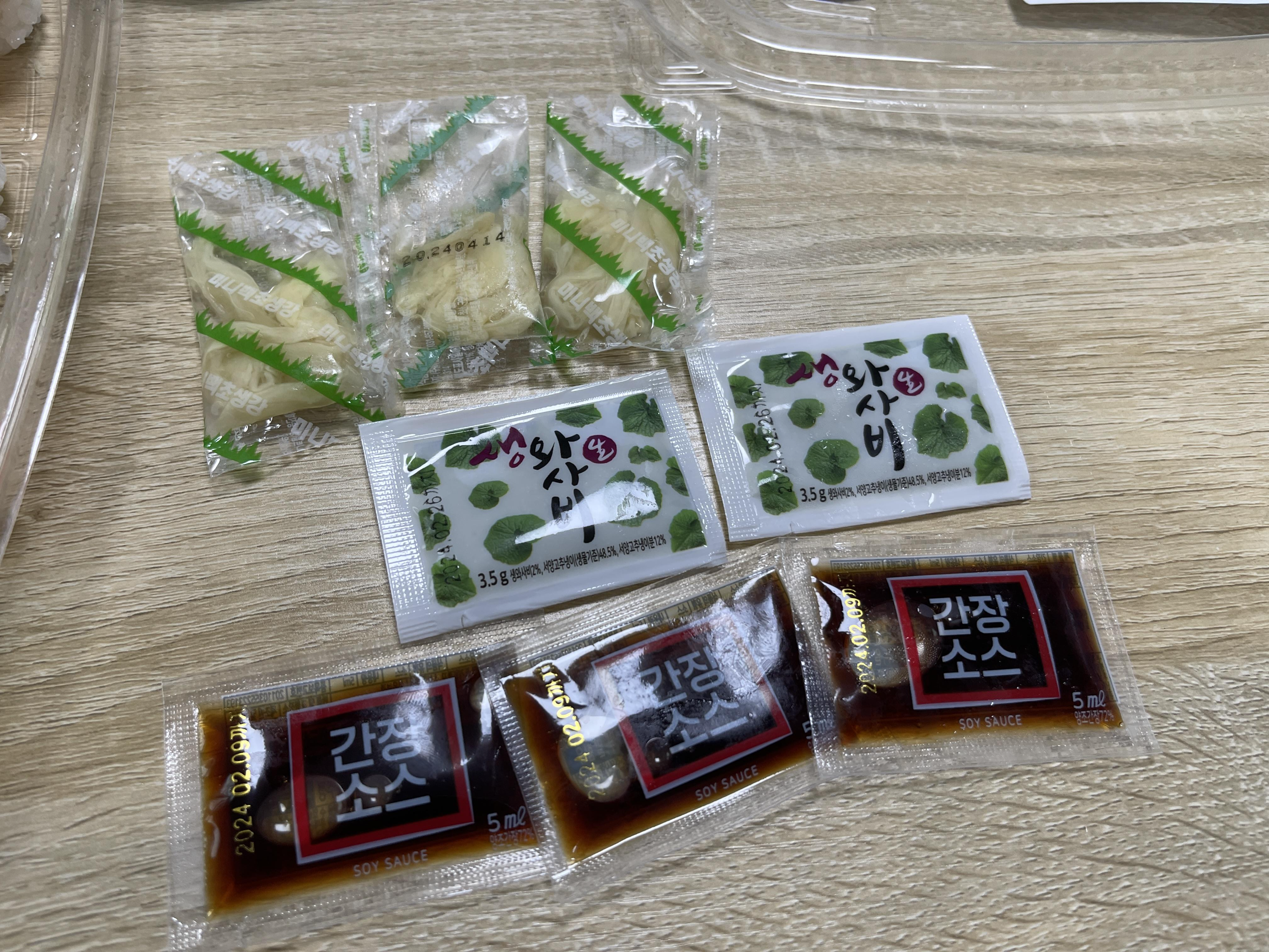 같이 들어있는 구성도 나쁘지 않았습니다. 가리 3개에 생와사비 2개 간장소스 3개가 들어있네요. 간장소스는 상당히 싱거웠습니다. 생와사비도 그렇게 맵지 않아서 별로였습니다. 오히려 가리가 나쁘지 않네요.
